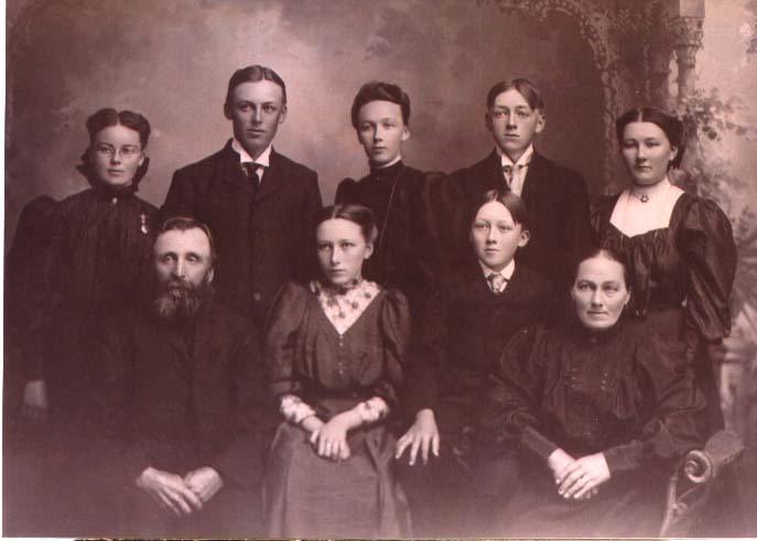Standing in the back row - Manilla, Nels Emil, Anna, Clarence, Nellie
