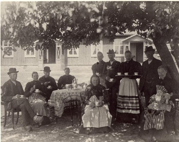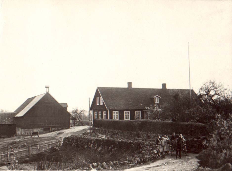 The Matriarch Hanna Trulsdotter with her daughter Karna's family outside the house in Eskilstorp. The names are (left to right). John Svensson - son of Karna (sn 21000) was the owner of Eskilstorp at the time. Sigrid Svensson - John's wife (sn 21001). Sven Johnsson - Karna's husband (sn 20001). Karna - Hanna's daughter (sn 20000). Matilda - Karna's daughter (sn 25000). Nils - Karna's son (sn 26000). Sissa - Karna's daughter (sn 24000). August Persson Karna's son in-law and Emilia's husband (sn 22001). Emilia - Karna's daughter (sn 22000) with her daughter Thyra in the lap. |